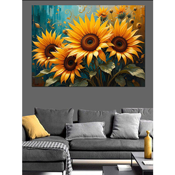 Tablomega Turkuaz Arka Plan Ayçiçekleri Dekoratif Kanvas - Mdf Ahşap Tablo 100x140 cm