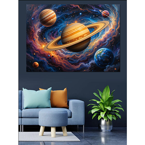Tablomega Uzayda Dönen Gezegenler Dekoratif Kanvas - Mdf Ahşap Tablo 70x100 cm