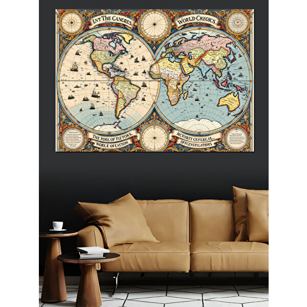 Vintage Harita Dünya Çizimi Dekoratif Kanvas - Mdf Ahşap Tablo