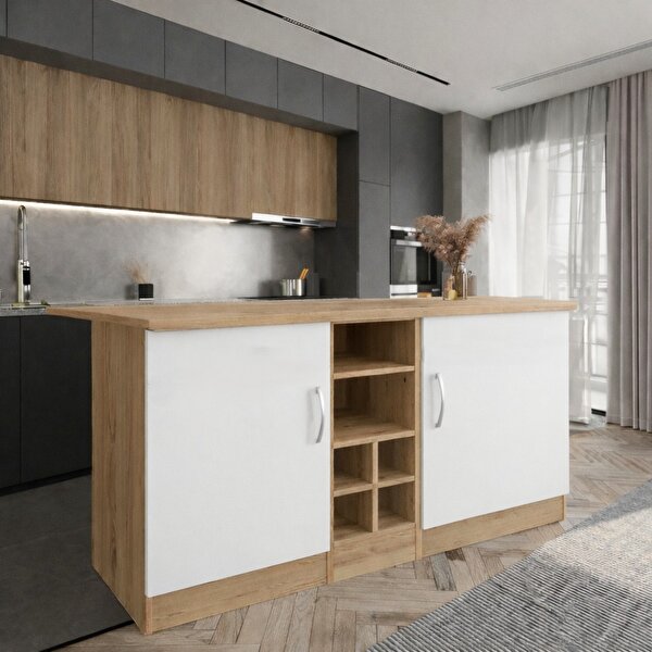 Ürün ada şeklindedir. •1.Kalite 18mm kalınlığında yongalevha/suntalam plakalardan üretilmektedir. •Ürüne ait tüm parçalarda 1.sınıf pvc bant uygulanmıştır. •Mutfak Dolabı Alt : Genişlik: 150 cm Derinlik:41,8 cm Yükseklik:85 cm •Tezgah : Genişlik: 151 cm Derinlik:60 cm Adanın toplam yükseklik :86,8 cm 20 cm sandalye boşluğu bulunmaktadır. ürün 2 adet 60 cm dolap ve 1 adet 30 cm açık dolaptan oluşmaktadır. 60 cmlik dolapların içerisinde 1 er adet raf bulunmaktadır. Paket İçeriği: 1adet Mutfak Adası Kurulum Şablonu ve Bağlantı Aksesuarları -Geniş saklama alanı ve raflar sayesinde eşyalarınızı muhafaza edebilir,dekoratif aksesuarlarla tamamlayabilirsiniz. •-Hasarsız ve sorunsuz bir teslimat süreci için ürünlerimiz en doğru yöntemlerle paketlenerek sizlere teslim edilmektedir. •Fabrikamızda demonte olarak hazırlanan ürünlerimizin paketlenmesinde, Ürün köşelerinin deforme olmasını engellemek amacıyla, köşe koruyucu kullanılarak paketleme yapılmaktadır. •Dış koli ambalajında ise 5 katmanlı oluklu mukavva kullanılmaktadır. •Böylece en hassas ürünler bile güvenli şekilde taşınabilmektedir. •Tüm kartonlar %100 geri dönüşüm özelliğine sahiptir. •-Kurulum Bilgisi: Ürünlerimiz demonte olarak gönderilmektedir ve kurulum müşteriye aittir. •Paketin içerisinden çıkan kurulum şablonu ile ürününüzü keyifle kullanıma hazırlayabilirsiniz. •Daha kolay bir kurulum için tüm parçalar üzerinde bulunan numaralar sayesinde, bağlantı aksesuarlarının yerini kolayca bulabilirsiniz. •-1.Sınıf Hammadde İle Üretim: Ürünlerimiz Suntalam olarak bilinen, sağlığa zararsız, kanserojen madde içermeyen Avrupa E1kalite standartlarında yonga levhalardan üretilmiştir. •Üretimde kullanılan tüm malzemeler çevre ve çocuk sağlığı standartlarına uygundur. •Ürünlerimiz kendi fabrikamızda, yüksek teknolojili makine parkurlarında tüm aşamaları özenle kontrolden geçerek sizlere ulaşmaktadır. •Üretimin tüm aşamalarının dijital ortamda gerçekleşmesi sayesinde hata minimum düzeydedir.