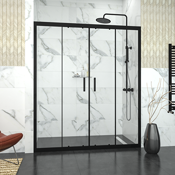 Teknoduş Black Castor 6mm Şeffaf Cam Orta Açılır 2 Sabit 2 Açılır İki Duvar Arası Duşakabin 188 cm