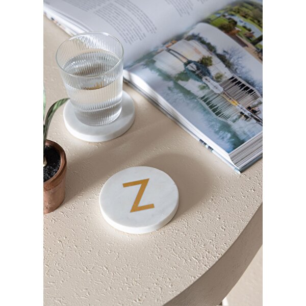 Doğal mermer dokusu ve üzerindeki el işçiliği pirinç harf detayıyla hem fonksiyonel hem dekoratif bir kullanım sunar. Minimal ve zamansız tasarımı sayesinde farklı dekorasyon stillerine kolayca uyum sağlar. Masa üzerinde estetik bir görünüm oluştururken bardak ve fincanlar için koruyucu bir yüzey sunar.