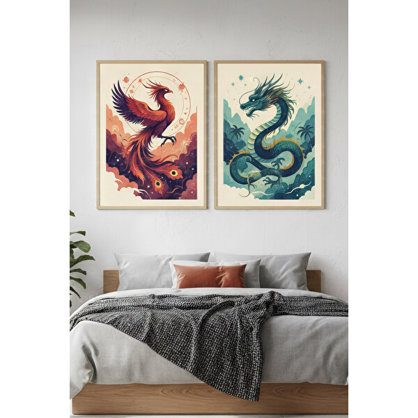 fsanevi bir atmosfer kazandırır.  Turuncu ve mavi tonların kontrastı, ateş ve su elementlerinin dengesini yansıtarak modern mekanlarda etkileyici bir odak noktası oluşturur.  Yatak odası, oturma alanı veya çalışma odasında mistik ve sanatsal bir hava yaratmak için mükemmel bir seçimdir.   Ürün Özellikleri:  - 2 Parçalı Tasarım: Anka kuşu ve ejderha illüstrasyonları.  - Kaliteli Baskı: Canlı renkler ve detaylı mitolojik çizimler.  - Ahşap Çerçeve: Zarif, doğal çerçeve görünümü.  - Kolay Montaj: Asma aparatları dahildir.   Ürünün diğer boyutları için mağazamızı ziyaret ediniz.