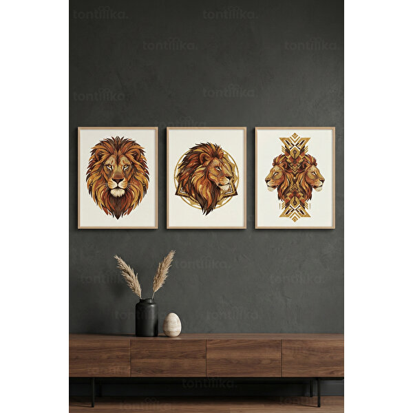llüstrasyonları ve altın tonlu vurgularıyla mekânda güçlü bir karakter oluşturur. Her bir tablo, aslanın farklı bir duruşunu ve ifadesini yansıtarak sete dinamik ve etkileyici bir bütünlük kazandırır. Cesur sanat anlayışıyla tasarlanan bu set; modern, maskülen ve iddialı dekorasyon tarzını benimseyen yaşam alanları için öne çıkan bir duvar dekoru seçeneğidir. Ürün Özellikleri:- 3’lü uyumlu ve karakter odaklı set tasarımı- Aslan figürlü güçlü ve simgesel illüstrasyonlar- Altın ve toprak tonlarıyla zenginleştirilmiş renk paleti- Ahşap çerçeveli, sağlam ve hafif yapı- Kaliteli ve uzun ömürlü baskı- Salon, ofis ve çalışma alanları için ideal- Asmaya hazır şekilde gönderilir Ahşap çerçeveli olarak gönderilir.