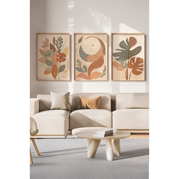 imalist çizgilerle bir araya getiriyor. Doğal renk geçişleri ve sade kompozisyonuyla evinizde sıcak, dengeli ve huzurlu bir atmosfer oluşturur.   - 3 Parçalı Tasarım: Bitki, yaprak ve ay figürlerinin modern yorumu.  - Kaliteli Baskı: Canlı ama soft renklerle estetik bir görünüm.  - Ahşap Çerçeve: Dekoratif ve uzun ömürlü çerçeve yapısı.  - Kolay Montaj: Asma aparatları dahildir.   Modern ve boho dekorasyon tarzı için mükemmel bir tamamlayıcıdır.  Ürünün diğer boyutları için mağazamızı ziyaret ediniz.