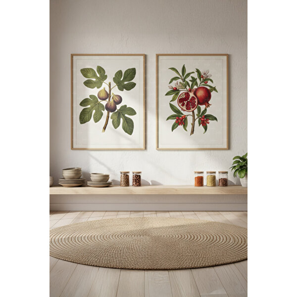 osfer oluşturur.  Yeşil ve kırmızı tonlarının dengesiyle sade, huzurlu ve ferah bir dekorasyon sunar.   Ürün Özellikleri:  - 2 Parçalı Tasarım: İncir ve nar bitki illüstrasyonları.  - Kaliteli Baskı: Canlı renkler, yüksek çözünürlüklü mat yüzey.  - Ahşap Çerçeve: Doğal tonlarda sade çerçeve tasarımı.  - Kolay Montaj: Asma aparatları dahildir.   Ürünün diğer boyutları için mağazamızı ziyaret ediniz.