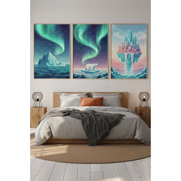 uuml; ahşap çerçeveli tablo seti, masalsı bir atmosfer yaratır. Mavi, mor ve yeşil tonlarının uyumu sayesinde yatak odası, salon veya çalışma alanlarına estetik ve huzurlu bir dokunuş katar.   Ürün Özellikleri:  - 3 Parçalı Tasarım: Kuzey ışıkları, buzullar ve kutup ayısı illüstrasyonları.  - Kaliteli Baskı: Canlı renkler ve uzun ömürlü baskı teknolojisi.  - Ahşap Çerçeve: Dayanıklı ve doğal malzeme.  - Kolay Montaj: Asma aparatları dahildir.   Ürünün diğer boyutları için mağazamızı ziyaret ediniz.