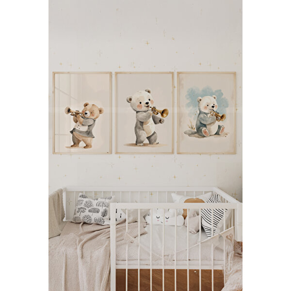 cak bir atmosfer kazandırıyor. Pastel tonlar ve sevimli figürler, çocuk odası dekorasyonuna uyum sağlar.   Ürün Özellikleri:  - 3’lü Set: Trompet çalan ayıcık figürleri.  - Ahşap Çerçeve: Dayanıklı ve estetik görünüm.  - MDF Üzeri UV Baskı: Canlı ve uzun ömürlü renkler.  - Çocuk Odasına Uygun: Eğlenceli ve sevimli konsept.  - Kolay Montaj: Asma aparatları dahildir.   Her siparişte 3 adet çerçeveli tablo gönderilir.