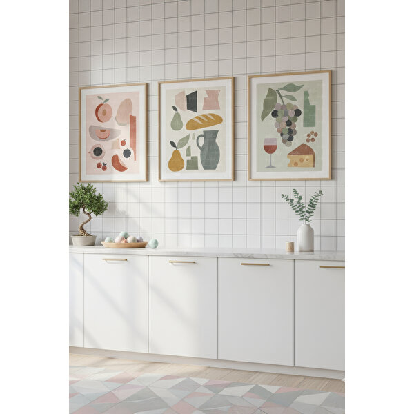 dil;erçeveli tablo seti, pastel tonları ve geometrik formlarıyla dikkat çeker. Minimalist ve sanatsal tarzıyla mutfak ve yemek odalarında sıcak bir atmosfer oluşturur.   Ürün Özellikleri:  - 3 Parçalı Tasarım: Meyve, şarap ve ekmek illüstrasyonları.  - Kaliteli Baskı: Canlı renkler ve uzun ömürlü baskı teknolojisi.  - Ahşap Çerçeve: Doğal görünümlü, dayanıklı yapı.  - Kolay Montaj: Asma aparatları dahildir.   Modern ve sanatsal mutfak dekorasyonu için ideal bir tablo seti!  Ürünün diğer boyutları için mağazamızı ziyaret ediniz.