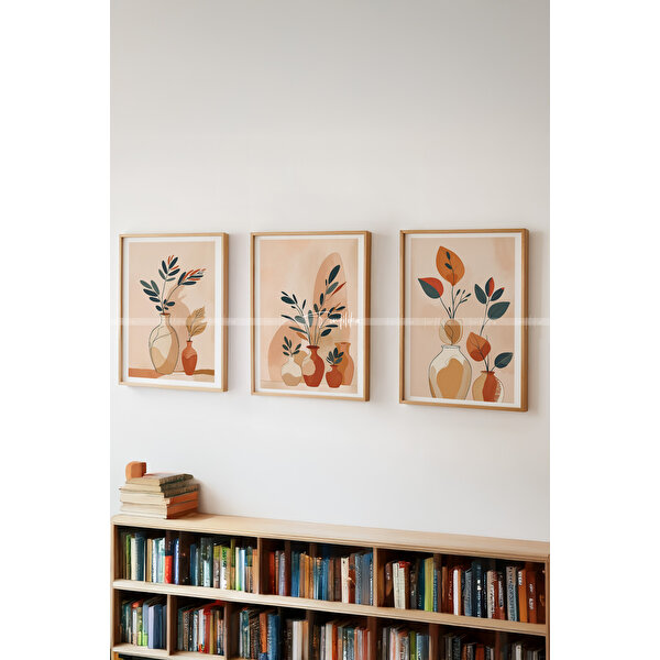 çenek sunuyor. Zarif çiçekler ve vazoların soyut çizimlerinden oluşan tasarımlar, her ortama sıcak bir dokunuş katar. Ürün Özellikleri: Soyut Çizimler: Minimalist ve estetik vazo çizimleri.Ahşap Çerçeve: Doğal görünümlü, dayanıklı malzeme ile üretilmiştir.Canlı Renkler: Yüksek kaliteli ve uzun ömürlü baskı.Kolay Montaj: Asma aparatları ile birlikte gönderilir.Kullanım Alanı:Salon, oturma odası, çalışma odası veya kitaplık alanlarında şık bir dekorasyon sağlar.