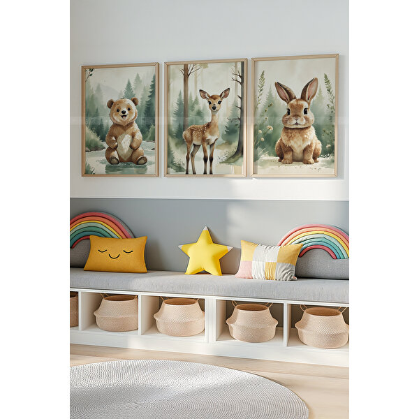 sıcak tonlarıyla odanıza masalsı bir atmosfer kazandırıyor. Çocukların hem keyifle bakacağı hem de dekorasyonu tamamlayacağı özel bir tasarım.   Ürün Özellikleri:  - 3’lü Set: Ayı, geyik ve tavşan figürlü tablolar.  - Ahşap Çerçeve: Dayanıklı ve şık görünüm.  - MDF Üzeri UV Baskı: Canlı renkler, uzun ömürlü baskı kalitesi.  - Çocuk Dostu Tasarım: Yumuşak ve pastel tonlar.  - Kolay Montaj: Asma aparatları dahildir.   Her siparişte 3 adet çerçeveli tablo gönderilir.