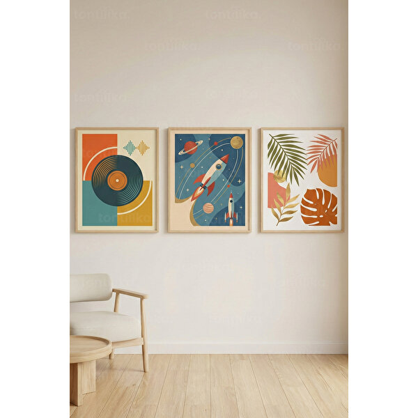 tablo seti, yaşam alanlarına enerjik ve yaratıcı bir karakter kazandırır.Plak formundan ilham alan grafik tasarım, dinamik uzay kompozisyonu ve stilize bitki illüstrasyonları; set içinde dengeli ve uyumlu bir görsel bütünlük oluşturur. Renkli ama sade yapısıyla modern dekorasyonlara güçlü bir vurgu yapar. Ürün Özellikleri:- 3’lü Ahşap Çerçeveli Tablo Seti- Retro modern illüstrasyon tarzı- Müzik, uzay ve botanik temalı özgün tasarımlar- Mat yüzey, kaliteli baskı- Duvara asmaya hazır şekilde gönderilir Ürünün diğer boyutları için mağazamızı ziyaret ediniz.
