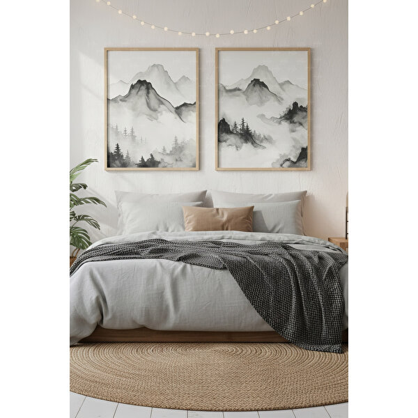 il;işlere sahip mürekkep efektli tasarımıyla yatak odası, oturma alanı veya çalışma odasında minimalist bir denge sağlar.   Ürün Özellikleri:  - 2 Parçalı Tasarım: Dağ ve orman manzaralı illüstrasyonlar.  - Kaliteli Baskı: Mat yüzeyde net ve detaylı çizimler.  - Ahşap Çerçeve: Doğal görünümlü sade çerçeve tasarımı.  - Kolay Montaj: Asma aparatları dahildir.   Ürünün diğer boyutları için mağazamızı ziyaret ediniz.
