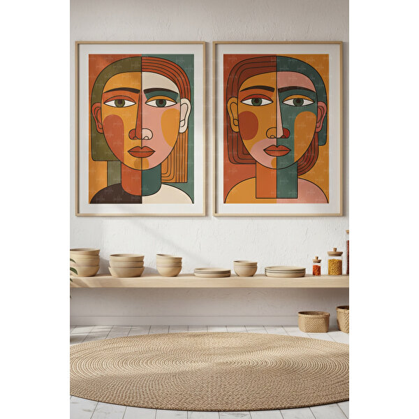 turuncu, yeşil ve bej tonlarının uyumu, mekanlara güçlü ama dengeli bir karakter kazandırır.  Oturma odası, çalışma alanı veya sanat dolu köşeler için etkileyici bir dekoratif seçimdir.   Ürün Özellikleri:  - 2 Parçalı Tasarım: Soyut yüz ve geometrik kadın portreleri.  - Kaliteli Baskı: Canlı renkler, detaylı çizim kalitesi.  - Ahşap Çerçeve: Doğal tonlarda sade ve zarif tasarım.  - Kolay Montaj: Asma aparatları dahildir.   Ürünün diğer boyutları için mağazamızı ziyaret ediniz.
