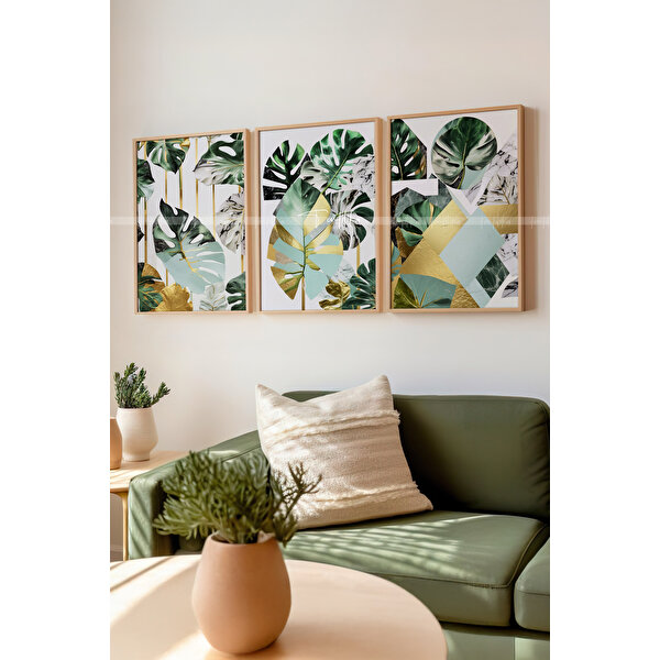 göz alıcı uyumu, odanıza zarif bir atmosfer kazandırır. Minimalist tasarımıyla oturma odasından yatak odasına kadar her ortamda mükemmel bir dekoratif seçenek sunar. Ürün Özellikleri: 3 Parçalı Tasarım: Tropikal yaprakların geometrik desenlerle buluşması.Ahşap Çerçeve: Şık ve dayanıklı yapısıyla doğal bir görünüm sağlar.Parlak Renkler: Kaliteli baskı teknolojisiyle canlı ve uzun ömürlü renkler.Kolay Montaj: Asma aparatları kutuya dahildir. Dekorasyonunuza sıcak ve tropikal bir dokunuş yapmak istiyorsanız bu set tam size göre!