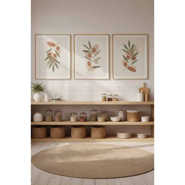 li tablo seti, mutfağınıza sıcak ve samimi bir atmosfer kazandırıyor. Pastel tonlarla tasarlanan tablolar, hem rustik hem de modern dekorasyon tarzlarına uyum sağlar.   Ürün Özellikleri:  - 3 Parçalı Tasarım: Zeytin dalı illüstrasyonlarından oluşur.  - Ahşap Çerçeve: Şık ve dayanıklı çerçeve yapısı.  - Kaliteli Baskı: Canlı renkler, uzun ömürlü baskı teknolojisi.  - Kolay Montaj: Asma aparatları dahildir.   Ürünün diğer boyutları için mağazamızı ziyaret ediniz.