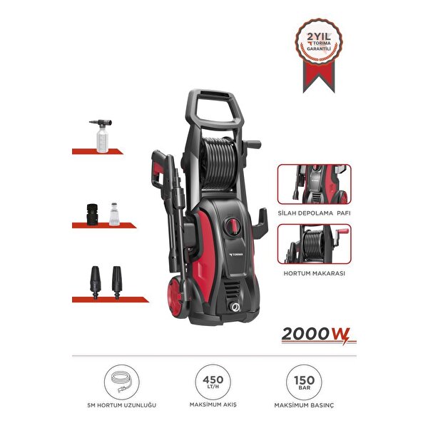Torima Oto Halı Bahçe Temizleme Ve Yıkama Makinesi 2000w 150 Bar Yüksek Basınçlı Hpc01 Kırmızı