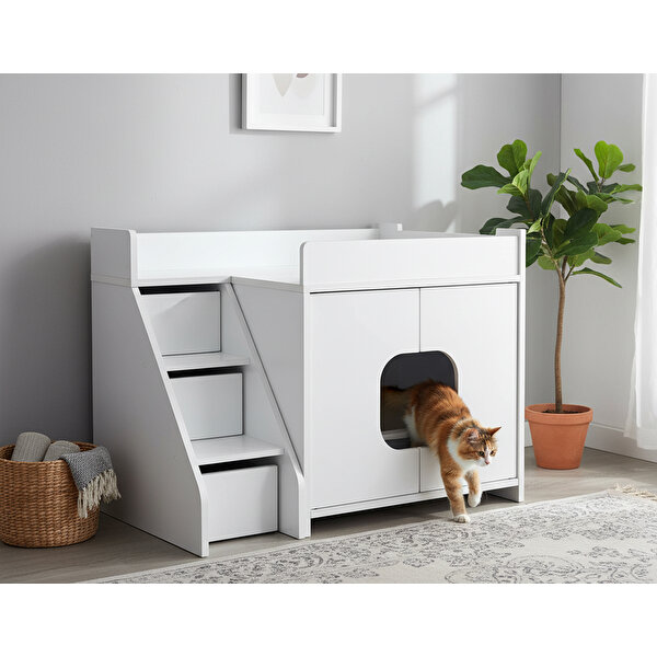 Üst kısmında geniş bir yatak alanı, alt bölümünde ise kapalı bir yuva yer alır. Merdivenli tasarımı sayesinde kediniz kolayca çıkıp inebilir. İç kısmındaki gizli bölmeler, kediniz için güvenli ve huzurlu bir saklanma köşesi oluşturur. Hem estetik hem fonksiyonel olan bu kedi evi, ev dekorasyonuna da şık bir şekilde uyum sağlar.