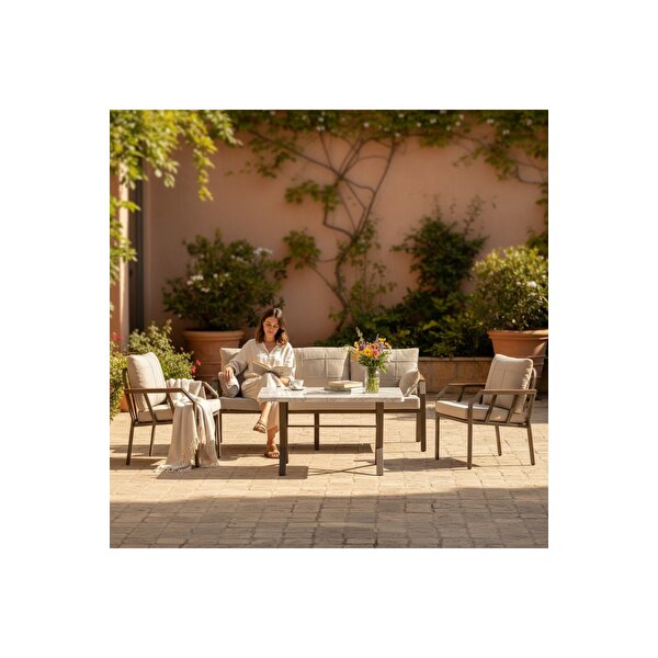 Paket İçeriği:;Üçlü Koltuk x 1 Adet (Minder ve yastık dahil);Tekli Koltuk x 2 Adet (Minder ve yastık dahil);Masa x 1 Adet (70*120);Kurulum Şeması ve Gerekli Malzemeler;ÜRÜN ÖZELLİKLERİ:;ÖZEL ARAÇ BOYASI(STATTİK) BOYANMIŞTIR,PASLANMA VB DURUMLAR YAŞANMAMAKTADIR.;ÜRÜNLER HER TÜRLÜ DIŞ MEKANDA VE İÇ MEKANDA KULLANIMA UYGUNDUR.;PROFİLLERİN ET KALINLIĞI 1.20 MM'DİR |20X60| DAYANIKLI PROFİLDEN ÜRETİLMİŞTİR.;ÜRÜNLERİN OTURAK KISIMLARI 3 MM HASIR TEL İLE KAYNAK YAPILARAK GÜCLENDİRİLMİŞTİR.;ÜRÜNLERİN SÜNGER OTURAKLARI 22 DANSTE OLUP 9 CM KALINLIĞINDADIR VE YATAŞ MARKA SÜNGER KULLANILMIŞTIR.;ÜRÜN SIRT YASTIKLARI 3 BÖLMELİDİR,YASLANILDIĞINDA SAĞ-SOLA TOPLANMA VB DURUMLAR YAŞANMAMAKTADIR.;SIRT YASTIK ELYAF VE SÜNGER KARIŞIMI MEVCUTTUR.;HER OTURAK KOLLARINDA ÖZEL AHŞAP PAPEL VARDIR.;ÜRÜN EBATLARI:;ÜÇLÜ OTURAK İÇTEN İÇE 190 CM 55 CM DERİNLİGİNDEDİR ,DIŞTAN DIŞA ÖLÇÜSU 200 CM'DİR.;ÜÇLÜ OTURAK VE TEKLİ OTURAK DERİNLİK 55 CM. SIRT YASTIĞI İLE DERİNLİK 51 CM.;OTURAKLARIN YÜKSEKLİĞİ TEKLİ VE ÇİFTLİ OLARK 39 CM,SÜNGER İLE YÜKSEKLİK TOPLAMDA 48 CM.;MASA 70*120 Y:70 CM.;ÜRÜN DETAY:;ÜRÜNLER KAPİÇİNO METAL 3+1+1+MASA OLARAK GELMEKTEDİR.;HER OTURAĞIN AYAĞINDA ZEMİNİN CİZİLMEMESİ İÇİN PAPUÇ VARDIR.;MASA AYAKLARINDA AYARLANABİLİR AYAK MEVCUTTUR.;ÜRÜNLER HER TÜRLÜ DIŞ MEKANDA YAĞMUR VB DURUMLAR KULLANILMAYA UYGUN ÜRETİLMİŞTİR.;KUMAŞ RENGİ KREM.;KUMAŞ CİNSİ KETEN.;ORTAM VE IŞIKLANDIRMADAN DOLAYI UFAK TON FARKLARI OLABİLİR.