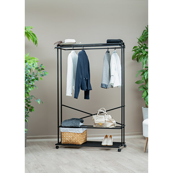 Modern tasarımıyla dikkat çeken 2 Yönlü Siyah Metal Raflı Elbise Askısı, şıklığı ve fonksiyonelliği bir arada sunar. - Elbise askılığı kolay taşıma için 4 tekerleğe sahiptir. Dört tekerleğin tümü 360° döndürülebilir, böylece elbise askılığını odadan odaya kolayca hareket ettirebilirsiniz. - Dayanıklı metal malzemesi uzun ömürlü kullanım vaat ederken, modern görünümüyle dekorasyonunuza estetik bir dokunuş ekler. - Metal yapısı sayesinde uzun yıllar boyunca güvenle kullanabileceğiniz dayanıklı bir üründür. - Demonte özelliği sayesinde kurulumunu zahmetsizce yapabilir, istediğiniz yere kolayca taşıyabilirsiniz. - 3 rafı sayesinde hem askılıklarınızı düzenleyebilir hem de katlanabilir kıyafetlerinizi veya kutularınızı yerleştirebilirsiniz. - Her türlü dekorasyon tarzına uyum sağlayan modern ve şık bir görünüm sunar. - Minimalist ve modern tasarımı ile her türlü dekorasyon stiline uyum sağlar. - Kolayca monte edilebilir ve demonte edilebilir, taşınabilir ve ihtiyaç duyduğunuz her yerde kullanılabilir. - Hem evinizde hem de işyerinizde, profesyonel veya kişisel kullanım için mükemmeldir. - Herhangi bir alete gerek duymadan, ürün ile birlikte gönderilen alyanla kolaylıkla kurulum yapabilirsiniz. - Montaj malzemeleri ile birlikte demonte olarak gönderilmektedir. - Ürün Montaj şeması ile birlikte gönderilir kurulumu oldukça pratiktir. - Paslanma yapmaz elektrostatik toz boya ile fırınlanmıştır. - Yüksek standartlı paketleme aşamasından geçen ürünümüz çevre ve çocuk sağlığına uygun standartlarda üretilmiştir.