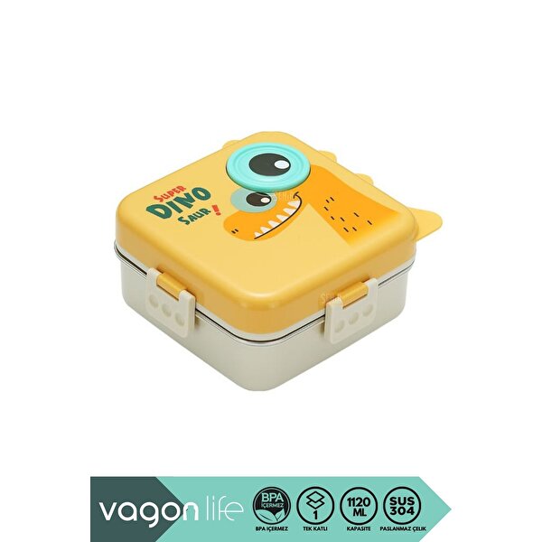 Vagonlife Bento 1120ml Lunchbox Dinozor Desenli Tek Katlı 3 Bölmeli Paslanmaz Çelik Sefer Tası Yemek Kutusu