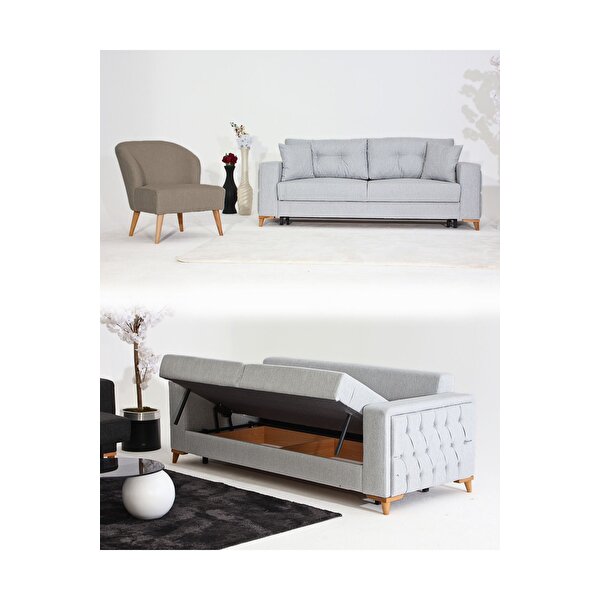 Velura Home Nola Koltuk Takımı 3+1 & Bazalı Yataklı Koltuk & Kanepe - Keten 3+1 Basamak