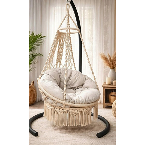 Woodshut El Örgüsü Makrome Salıncak - MİS38002M Bu şık ve rahat makrome salıncak ile evinize doğal bir dokunuş katın.; El emeğiyle örülmüş olan bu tek kişilik salıncak, 60x80 cm boyutlarıyla geniş bir oturma alanı sunar.; Her türlü dekorasyona uyum sağlayarak mekânınıza zarafet katar.; Kaliteli malzemesi ve sağlam yapısı sayesinde uzun ömürlüdür ve iç mekân kullanımına uygundur.; Dinlenmek ve rahatlamak için mükemmel bir seçenektir.; Evinizin balkonunda, bahçenizde veya oturma odanızda keyifli vakit geçirmek için ideal bir tercih.; Renk: Krem Boyutlar: Oturma kısmı 60 cm ve yaslanma kısmı 80 cm demir borudan üretilmiştir Özellikler: - Tek kişilik kullanım - El örgüsü polyester makrome - Dayanıklı ve sağlam yapı - 120 kg ağırlık taşıma kapasitesi - Asma kısmında radansa kullanılmıştır, kopma ve ipte çözülme olmaması için.; Asma yapabilmeniz için ürün ile birlikte çelik dübel ve fazladan ip gönderilmektedir.; Minderli gönderim yapılmaktadır.; Minder de boncuk elyaf kullanılmakta ve düğmeli üretim yapılmaktadır.; Minder kumaşı silinebilir kumaştır.; Minder renkleri: krem, bej, kahverengi ve antrasit (koyu gri) olarak üretilmektedir.; Minder rengi seçimizi lütfen sipariş sonrası mesaj ile belirtiniz.; ASKI DEMİRSİZ GÖNDERİM YAPILACAKTIR.