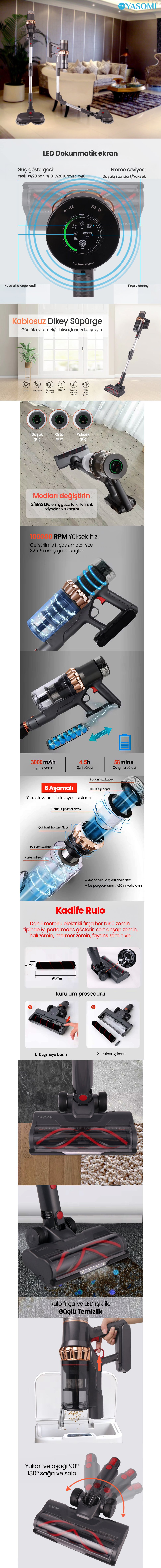 Yasomi Vion Plus V11 H12 Hepa Mop Başlık Led Işıklı Turbo Başlık Dikey Süpürge