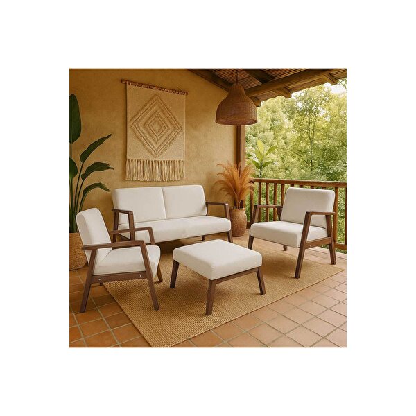 Zem Pavia Çay Seti Ceviz Ahşap, Kırık Beyaz (1 Adet Iki̇li̇ Berjer 2 Adet Tekli̇ Berjer 1 Adet Puf) Kırık Beyaz