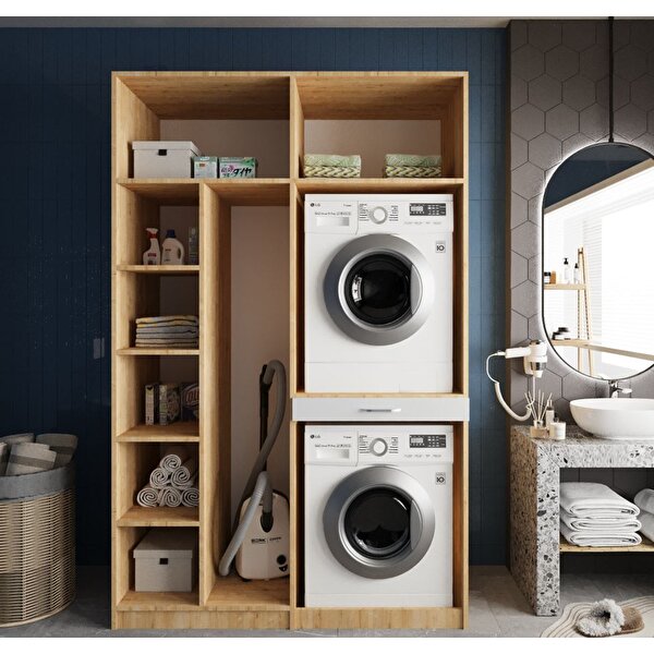 ZerkaConcept Megan Çamaşır Ve Kurutma Makinesi Dolabı Banyo Dolabı Meşe Beyaz- Montaj Dahil